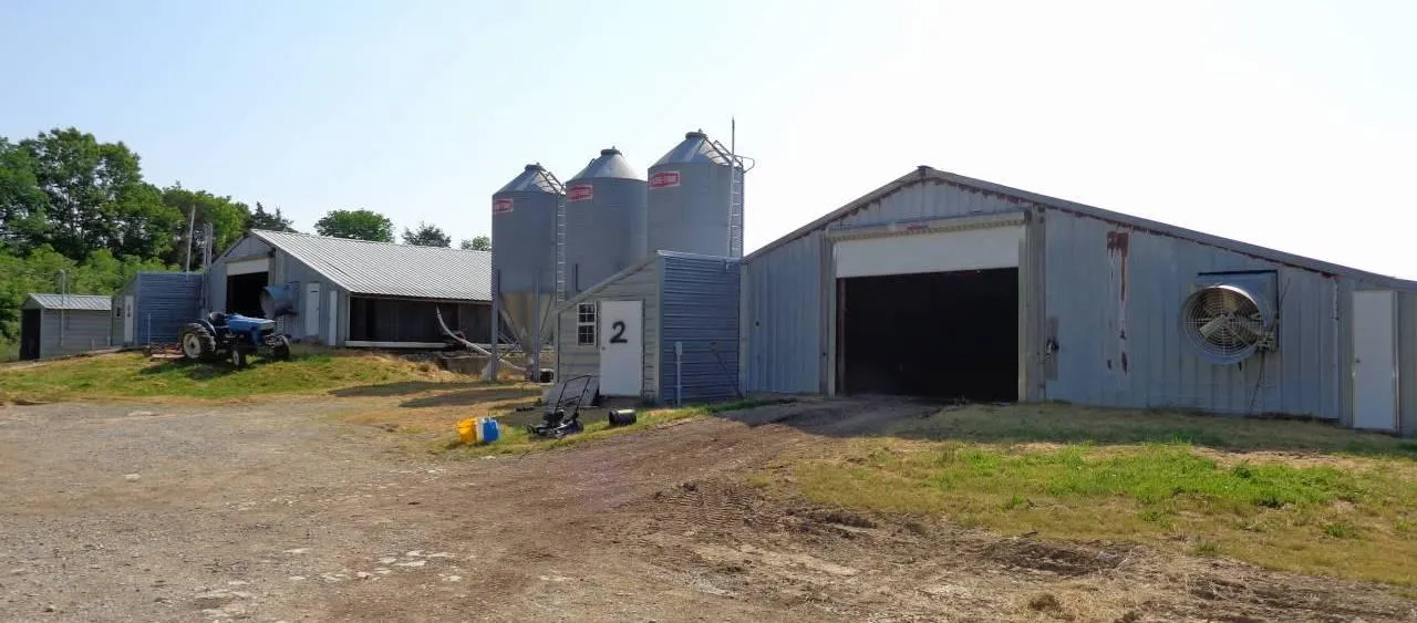 Sale includes (2) 40x400 poutry barns (1994), (2) 50x500 poultry barns (2006), litter barn, 2 generators, well water with county water backup, all on 34.46 acres.