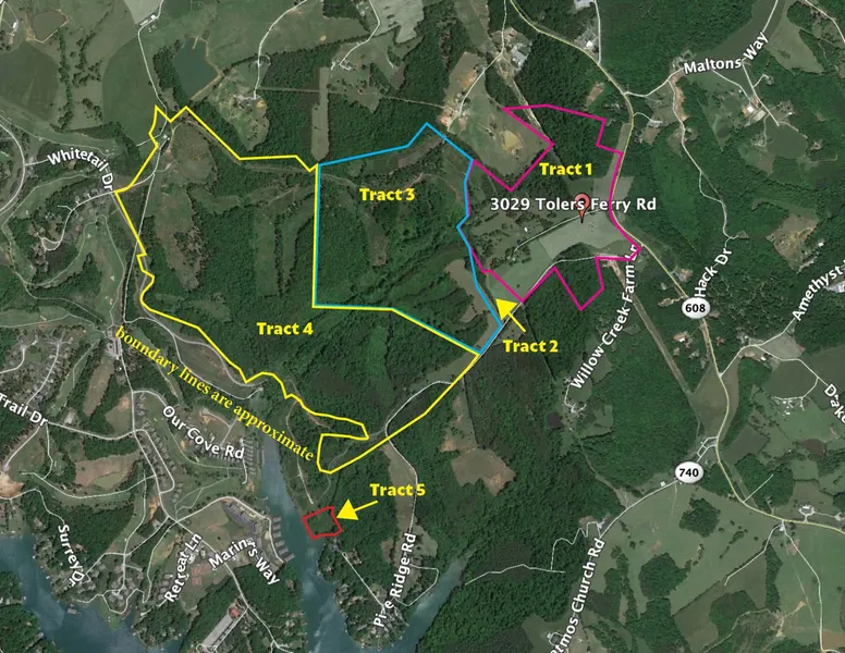 Research Parcel InformationFrom the intersection of Rt. 626 (Smith Mountain Lake Pkwy) and Rt. 608 (Tolers Ferry Rd) go 1.8 miles South on Tolers Ferry Rd. Tract 1 will be on the right. Go an additional 0.3 miles South on Tolers Ferry Rd to Pine Ridge Rd. and turn right. Watch for the tracts signs for Tracts 1 -4.
