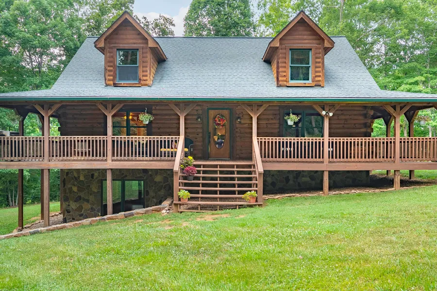 Country living with the convenience of being only four miles from the Town of Bedford. Beautiful wooded lot with mature trees surrounding this immaculate log home. Wrap around porch welcomes you to sit a spell & enjoy the world around you. Step inside the front door to a open living area. The kitchen is great for entertaining with lots of counter space & openness to the living room. Main level master bedroom with walk in closet. Large laundry room on the main floor as well. Second level hosts two large bedrooms with a shared bath & an open sitting area for reading a book or simply relaxing. Make your way to the lower level & find a large family room leading out to a small patio which is great for entertaining as well. This level also has a full bath & an office/study that would be great for guests. Circular driveway. Covered area now being used as kennels could be converted into covered storage. Oversized garage is climate controlled & makes a great area for family gatherings.