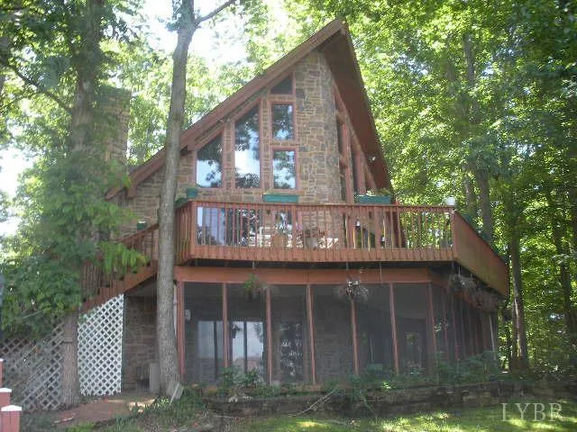 This waterfront home on Smith Mountain Lake is ready for you to make it home!! A-frame home features 3 bedrooms, with large master on terrace level with master bath and its own access to screened porch. Finished den in basement. Large living room with stone fireplace and beautiful built-ins. Eat-in kitchen has lots of room and access to deck. Loft area features another bedroom and bath. Nestled in the woods with lovely landscaping and a short stroll to the dock, which features two boat lifts, a sea-doo lift, a screened room upper level, and a sliding board! Directly across the lake from Mariners Landing...Summer fun awaits!! NEEDS TLC....SOLD AS-IS