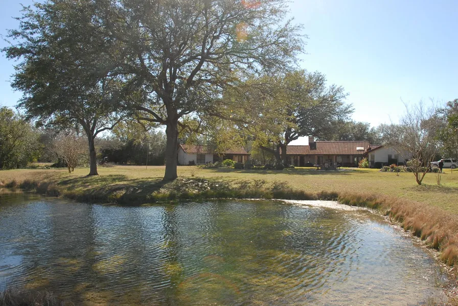 Home: The main house is a very attractive custom built home with 3 bedrooms , 2 bath and 2 car garage. BCAD describes the living area at 2326 sq. ft. Construction is concrete slab and stucco walls with concrete Spanish tile roof. Interior is stylishly appointed with Saltillo tile in most areas and carpet in bedrooms. The large comfortable living room with high beamed ceiling, plantation shutters and a rock wall that has a wood burning fireplace and looks out past a covered porch to large oaks, sculptured stock tank and on to a sendero. Kitchen has cypress cabinets with island cooking area. The island and surrounding wall has custom painted tiles by artist Shirley Kibler depicting the cactus and flowers of South Texas. There is a stainless double oven, black electric cooktop and stainless refrigerator. Two bedrooms, bath ...
