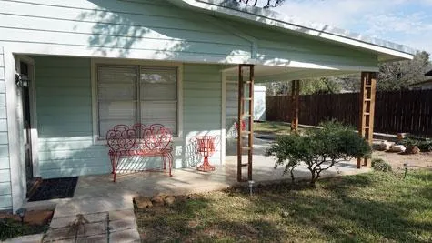 Precious 3 bedroom, 2 bath home in the quaint town of Tuleta. 3 huge oaks lend shade for the covered porch and patio. Spacious living areas and dining room are located in the center of the home with lots of natural light streaming thru. Popular split floor plan. White galley kitchen with glass tile backsplash and dark hardware. The spacious utility room is adorable with 2 glass doors, lots of windows and room for a freezer. Easy access from the utility room to the patio or the large back yard. Beautiful bathrooms with glass tile accents and white ceramic vanities. Laminate flooring. Two storage buildings. Room for garden.