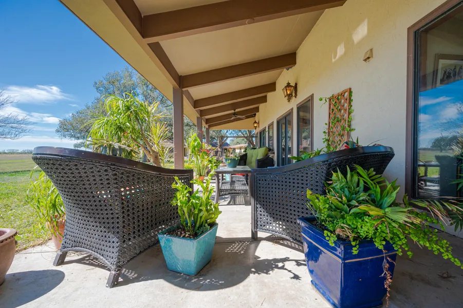 Oak lined drive leads to this beautiful stucco home built in 2005.. The metal construction enables the grand open floor plan, with a span of approx. 55' to accommodate the entry, several seating areas along with dining and kitchen. The ceiling soars to 20' in this great room. while large glass panes on the north and south side enable one to see for miles. Entertainment style kitchen with custom cabinetry, double dishwashers, double oven, built in microwave, prep sink and warming drawer. Primary bedroom is complimented with a corner fireplace and the spacious bath has a center island for storage,2 water closets, 2 separate vanities with sinks, large walk-in shower and jetted tub. 3 bedrooms and 2 baths are located on the east side of the house. A half bath and office complete this gorgeous home. 3 car garage, front covered porch and a covered back porch extends 77'. Also nearby is a gutte...