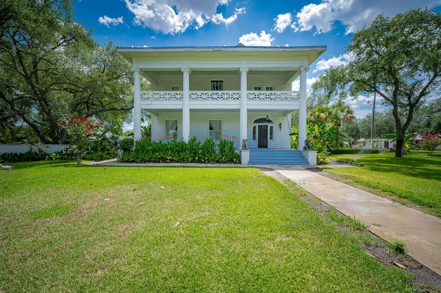 Built in 1907, this majestic and elegant Greek Revival home sits on 1.29 beautifully landscaped and meticulously maintained acres. Featuring high-end finishes,original hardwood floors, moldings and vintage touches throughout, the home reflects a timeless beauty. As you enter the home, the foyer and stately staircase greet you while the statement fireplace draws you into the well-appointed living room. The dining room, located off the living room, can accomadate a large gathering, and the custom built-in china cabinet can display even the most expansive collection. The more casual sunroom, with terrazzo floors and a hand-carved wooden door, faces the serene and well-shaded backyard. From there, you can access the backyard and roomy "bar-b-que house" , complete with a fireplace ,bar-b-que grill and comfortable seating area, perfect for outdoor gatherings. Inside the home, an elevator has been added to reach the second floor in addition to the staircase, and an additional staircase leads to the third floor. On the second floor, you will find a master suite and two more bedrooms and full baths. An additional sitting area can also be used as a fourth bedroom with bathroom access down the hall. The third floor has yet another bedroom and full bathroom that can be used as such or as a flex space. Going back down to the ground floor, another bedroom and full bath is located off the garage, but has been used in the past as an office.There is a three car garage with additional parking with electrical for rv available as well. This lot is so expansive, there is still enough room for a pool and game court. This home has been owned by only two families over the years. This is a rare opportunity to own such an iconic home in Beeville.