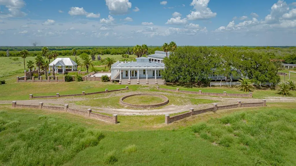 European Plantation style home on 92 acres south of Beeville. This 6211 sq. ft home is a work of art beginning with custom milled flooring, elaborate plasterwork, old Chicago brick, elegant lighting and sun-filled rooms. Kitchen is complete with CASTLE gas range and HOSHIZAKI refrigerator and freezer and copper countertop. This home consists of 2 primary suites, an additional bedroom and bath, office with half bath, exercise room, library, 2 large dining areas, 2 large living areas and upstairs you will find a bonus room with unique beamed ceiling. An outdoor dining room is covered, and access is gained through a courtyard with fountain. Massive wooden barn (8400 sq. ft), dog kennels, guest home is 2/2 with metal barn. This home is an excellent candidate for shared property ownership or Airbnb. Migratory bird path. Deer, dove and quail. Native and Improved grasses. Wet weather tank.