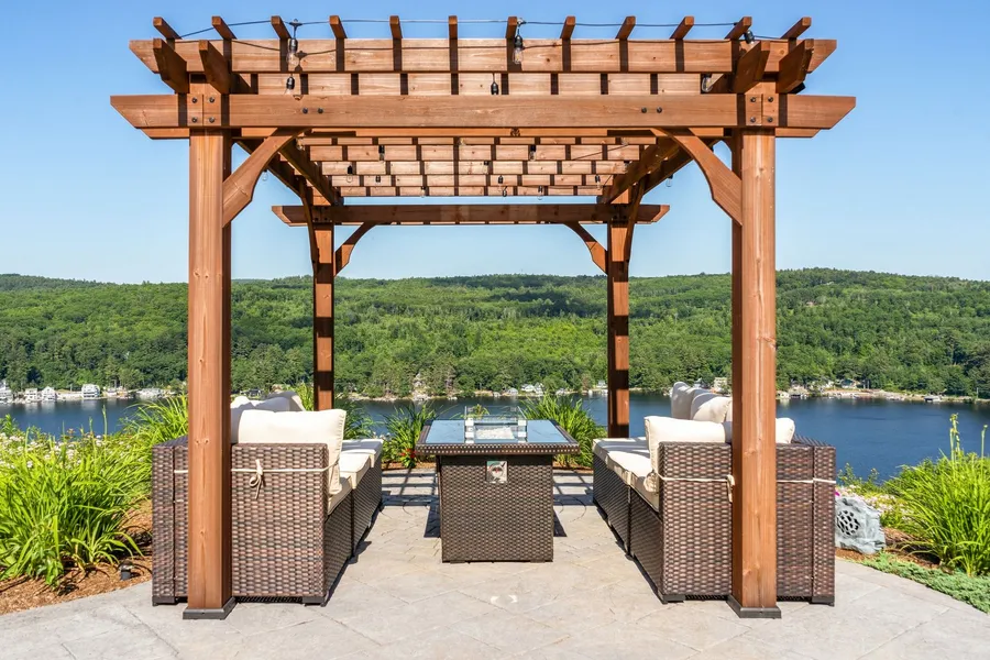 Situated high above Alton Bay with panoramic views is Villa Vista. This contemporary home sits on 11 acres of privacy with exquisite grounds and gated entry. The home was designed with abundant glass which allows for stunning views from almost every room. Interior features include one level living with a large primary suite, mission oak kitchen with marble countertops, commercial appliances, radiant heat, double sided gas fireplace, sauna and air conditioning. The exterior is a true oasis with a heated pool with extensive landscaping , covered patio, granite seating area and large composite deck with see through glass. For the car enthusiast you have an attached 2 car heated garage, detached 3 car garage and a open air 2 car stained wood garage. In the last few years numerous improvements have been made to the property including new hard board siding, new roof, new composite decks in the...