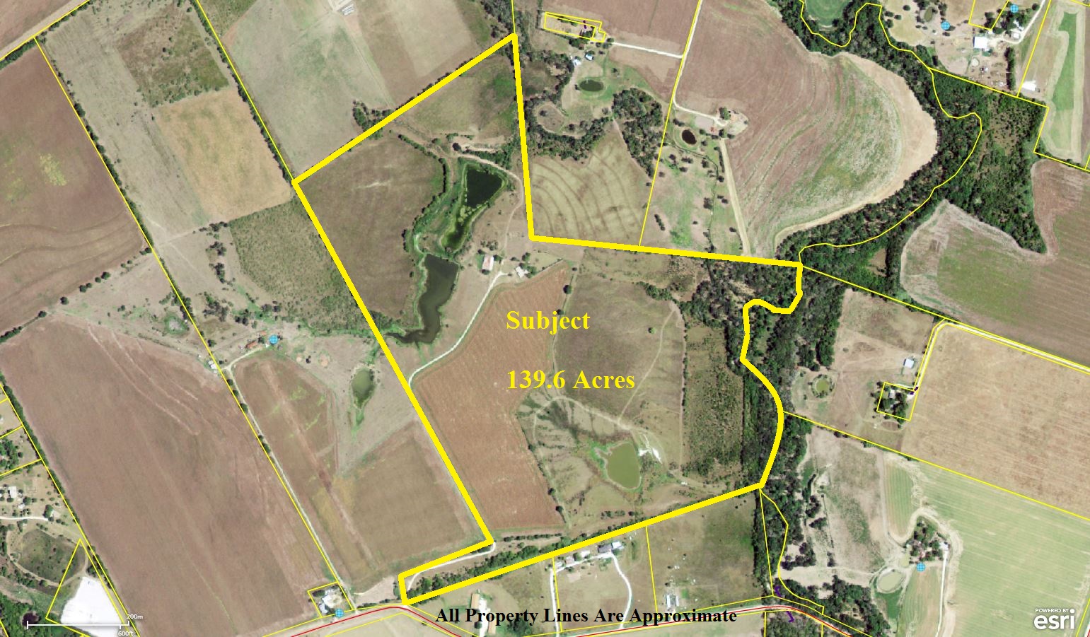 Secluded 2 Bdrm 2 Bath Brick Home with 2 car attached garage close in to Temple, on 139.6 Acres with elevation changes along Cottonwood Creek. Home has settling cracks. 3 Ponds/Stock Tanks with approx. sizes: 1 Ac, 1.5 Ac and 2.5 acres. Approx 24 ac in corn crop, 14 ac reclaimed cropland, and potential for approx 25 ac additional cultivated land. Barn/Equipment Shed=61x82+-; Workshop=18x28+-; Stg=8x9. Scattered Tree Coverage. Ag crops by tenant. No restrictions. If applicable, buyers who are represented by an agent/broker must have its agent/broker present at the initial and all showings.