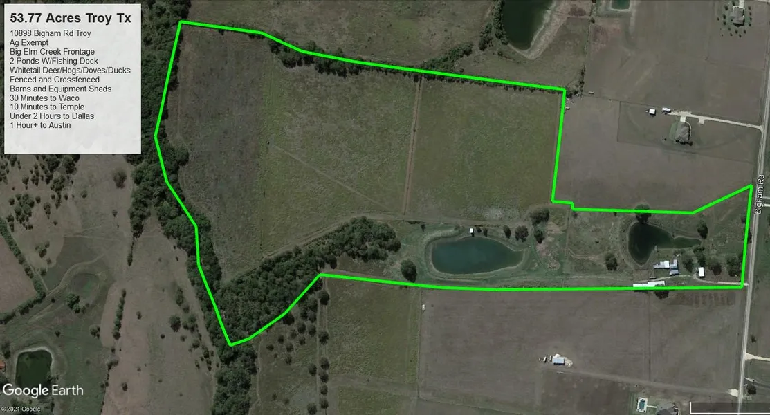REMARKABLE 57.33 ACRE PROPERTY JUST OUTSIDE OF TROY TEXAS THAT TRULY HAS IT ALL. IF YOU'RE LOOKING FOR A PROPERTY THAT IS AG EXEMPT, GREAT FOR CATTLE AND HORSES BUT ALSO HAS GREAT HUNTING AND FISHING, YOU HAVE FOUND IT. WHAT'S NOT TO LOVE HERE WITH LOTS OF BIG ELM CREEK FRONTAGE THAT HOSTS MATURE PECAN AND ELM TREES AND PROVIDES COVER FOR THE ABUNDANT WILDLIFE. TWO LARGE FISHING PONDS, ONE OF WHICH HAS A COVERED FISHING HUT THAT'S PERFECT FOR FAMILY OUTINGS. THERE'S PLENTY OF PASTURE LAND THAT IS FENCED AND CROSS FENCED. GREAT HOMESITES WITH INCREDIBLE VIEWS FOR MILES. LARGE BARN AND MANY EQUIPMENT SHEDS/SHOPS AND CORRALS FOR WORKING THE CRITTERS. WILDLIFE INCLUDES WHITETAIL DEER, HOGS, DUCKS, DOVES, RABBITS, SQUIRRELS, AND VARIOUS SPECIES OF FISH. NO RESTRICTIONS. FINDING ALL THESE QUALITIES IN ONE PROPERTY IS EXTREMELY RARE. ONLY 5 MINUTES TO I-35. TROY ISD. OFFERS WILL BE TAKEN THROUGH SUNDAY 3/7.