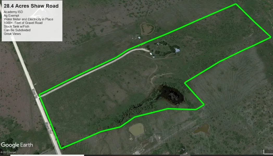 BEAUTIFUL SUNSETS AND CLEAN COUNTRY LIVING IS WAITING FOR YOU WITH THIS 28.4 ACRE GEM IN THE ACADEMY ISD. IMPROVEMENTS INCLUDE A WATER METER, ELECTRICITY, AND 1000+- FEET OF GRAVEL ROAD THAT TAKES YOU PAST MANY GREAT BUILDING SITES WITH VIEWS FOR MILES. THIS PROPERTY IS AG EXEMPT AND HAS PERIMETER FENCING, A BARN, AND A LARGE STOCK TANK WITH PLENTY OF BLACK BASS & PERCH. WILDLIFE TO INCLUDE DOVES, DUCKS AND THE OCCASIONAL WHITETAIL DEER. 15 MINUTES FROM TEMPLE AND I-35. SUBDIVIDING IS POSSIBLE WITHIN THE RESTRICTIONS.