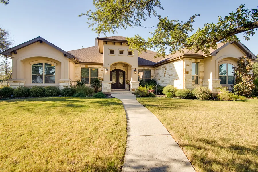 Wow! This gorgeous custom home boasts 4 BR, 3 BA, an office and a bonus/game room. Guests are greeted with a grand front view with large, mature trees, a beautiful steel front door, warm hardwood floors, and an open kitchen/living/dining concept. The kitchen features a large rounded island, double ovens, and large walk-in pantry. Take note of the beautiful wood beam detail on the ceiling! Travertine tile is a stunning feature in the bathrooms, as is the beautiful master bathroom with double vanities, garden tub and large walk-in closet. An expansive covered patio with outdoor grill is perfect for entertaining, and the wonderful back yard with mature trees backs up to an unimproved ranch property. This home is a true beauty!