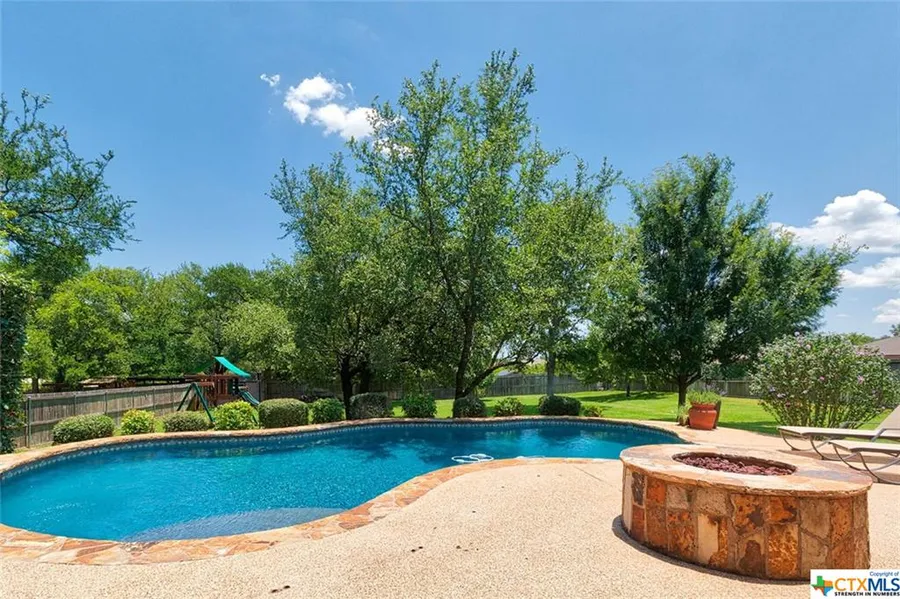 Absolutely beautiful inside and out, this stunning home sits on a half acre of prime property that is close to Belton Lake and filled with trees and tranquility. The perfectly manicured front lawn boosts the curb appeal that is strengthened by the side entry garage and classic landscaping. Perfect for hot Central Texas summer days, the backyard has a refreshing in-ground pool that overlooks the lush and landscaped yard with fruit trees and a playscape. A covered patio with built-in outdoor kitchen makes outdoor entertaining easy and there's a built-in firepit for year round enjoyment. Gorgeous wood floors begin in the entry and stretch to the office with a wall of built-in shelves and storage. Across the foyer is the dining room. The heart of this home is the dazzling gourmet island kitchen with granite counters, an abundance of cabinets, recessed and under cabinet lighting and a wraparound breakfast bar. The breakfast area and great room with fireplace are open to the kitchen. A double tray ceiling with unique paint finish adds character to the owner's suite bedroom and the bathroom has a corner soaking tub and separate shower. This home also has a spacious media room, a mud room for optimal organization, and pull-down stairs to attic.
