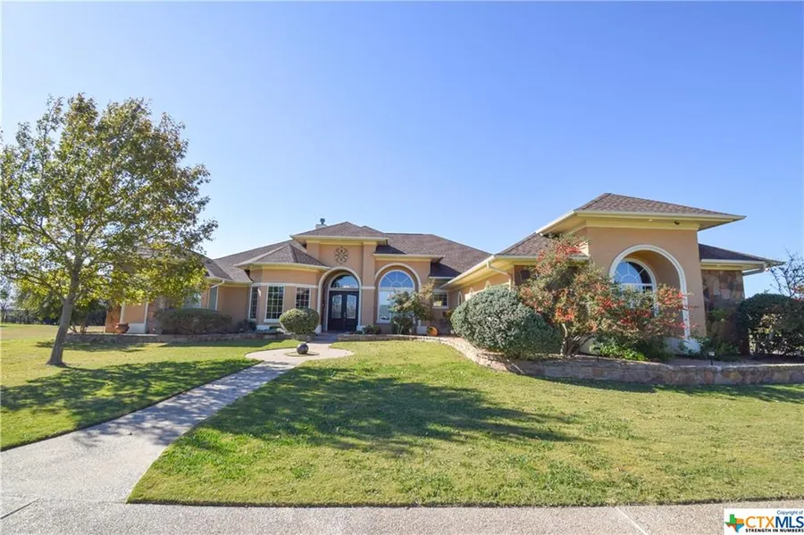 This gorgeous Mediterranean-style home was built with the growing family in mind. 4,050 sq ft of custom comfort are found in this 4 br/4.5 bath, split concept home. An outdoor paradise awaits at this stunning home set on 2.575 level acres. Plenty of room to add a custom pool. The massive steel covered patio features multiple ceiling fans, tile floor, a stone outdoor kitchen. This stately home features eye-catching landscaping which combines with the circular drive and enormous 3+ car garage and two 21' x 18' matching storage buildings. As you enter the home, soaring ceilings and an abundance of natural light highlight the warm tones. Lead beveled and stained glass features throughout the built-ins. The study/library has a beautiful wood floor and built-in book cases. Arches and crown molding in every living space. The gourmet kitchen is equipped with Sub Zero and Jenn-Air appliances, a c...