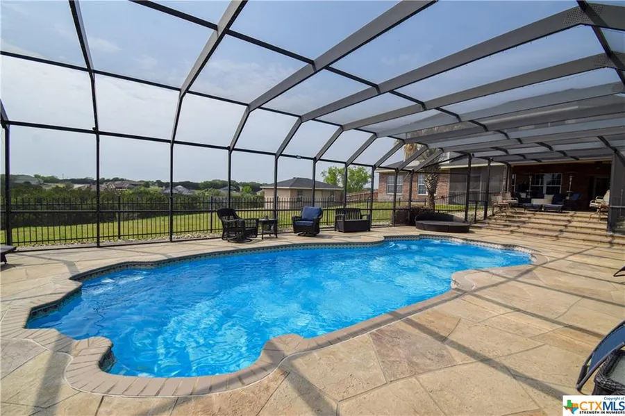 Welcome Summer in this gorgeous home located in Harker Heights! Experience the best Central Texas has to offer in this uniquely-built home with something for everyone. An enclosed pool is the center of backyard entertaining on an acre lot at the end of a quiet cul-de-sac. This 4 bedroom/3.5 bath home features a gas log fireplace, slate floors, 2-story ceilings, wet bar area with wine storage, and gourmet kitchen. The master bedroom is downstairs with a closet and bath area you need to see to believe! Upstairs features a huge bedroom en suite making it the perfect MIL or guest suite, or perhaps turn it into a bonus room, home schooling area, or a theater room for family movie or football nights. Two additional minor bedrooms and bath are adjacent to the hallway. The other side of the upstairs features an separate upscale wardrobe closet and a loft sitting area which opens to the second story balcony. Minutes from Fort Hood, shopping, and restaurants. One hour NW of Austin.