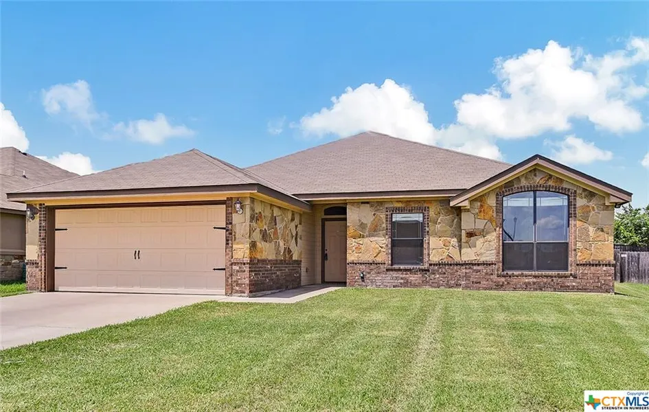 Just minutes from the lake, this house is perfectly located for quiet living that is still convenient to everything. The stone and brick exterior pops from the lush lawn for pleasing curb appeal and the spacious backyard is overlooked by a covered patio. Bold stained concrete floors throughout means easy maintenance and coolness in the heat of summer. The great room has a tray ceiling with crown molding and plenty of light thanks to a large window overlooking the backyard and recessed lighting too. Adjacent is the combination kitchen and dining room. Granite counters highlight the kitchen that also has plenty of cabinets and a lovely mosaic tile detail in the backsplash. The owner's suite bedroom has a tray ceiling and the bathroom has a soaking tub with separate shower and 2 walk-in closets. Additional amenities include a sprinkler system.
