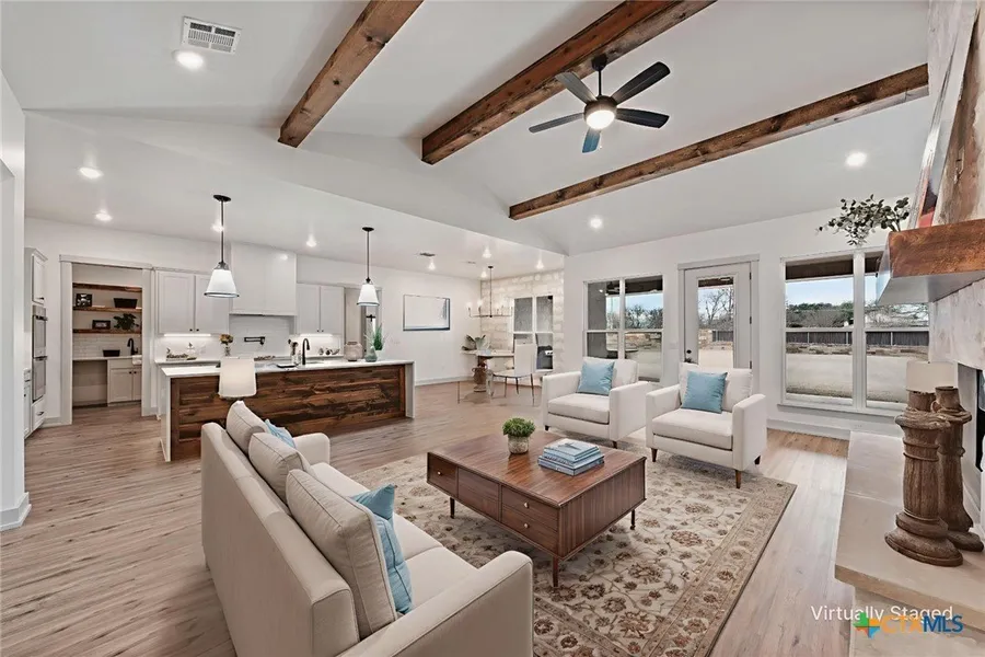 The moment you turn off the beaten path and head to this peaceful rural subdivision, the stress of the day fades away. Sitting gracefully on a corner half-acre lot, this home immediately impresses with its striking curb appeal and three-car side-entry garage, offering both beauty and function. Step inside, and the wide-open living space draws you in. A grand exposed beam ceiling soars above the great room, where a fireplace flickers and a wall of windows frames the expansive backyard. The island kitchen, complete with custom cabinetry and sleek finishes, flows effortlessly into the attached dining area-perfect for gatherings that linger long after the last bite. A private retreat, the owner's suite is designed for relaxation. Barn doors slide open to reveal a spa-like bathroom featuring a stand-alone soaking tub and a separate walk-in shower. Thoughtful design continues with a walk-in cl...