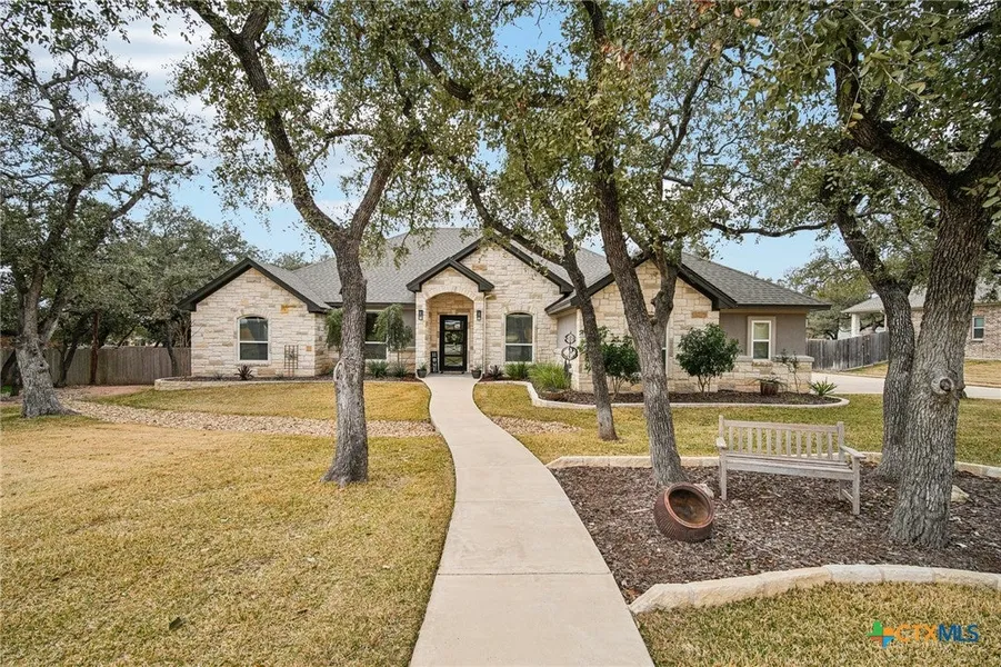 Nestled among mature oak trees, this beautifully landscaped home in Morgan's Point Resort offers elegance, space, and comfort. Boasting four sides of masonry with stone and stucco accents, this stunning residence features a three-car garage and a thoughtfully designed open floor plan. Elegant archways, high and vaulted ceilings, crown molding, and wood-look tile flooring throughout the main living spaces enhance its sophisticated appeal. The family room is a showstopper, featuring a dramatic floor-to-ceiling stone fireplace that adds warmth and character. A private office with French doors provides a quiet workspace, while the formal dining room and breakfast area offer versatile options for entertaining and everyday meals. The gourmet kitchen is a chef’s dream, featuring a large center island with ample seating, built-in appliances, and stylish finishes. The spacious primary suite is a true retreat, complete with a dual vanity, granite countertops, a relaxing garden tub, and an oversized walk-in shower. Step outside to the covered patio, perfect for outdoor gatherings, complete with a sink and counter space. The beautifully fenced backyard offers privacy and shade with its lush trees. Residents also enjoy access to a community pond, adding to the serene atmosphere. Located near the picturesque shores of Lake Belton, this home offers both tranquility and convenience.