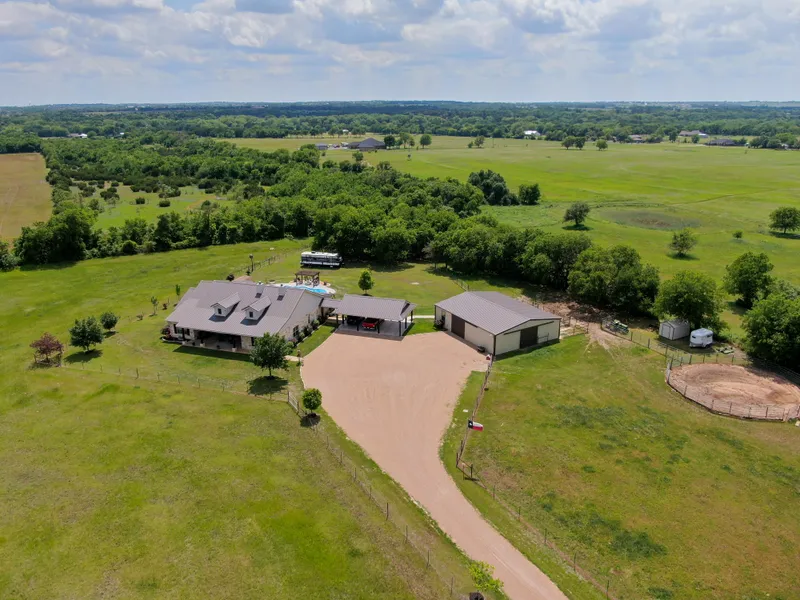 Start your morning with the most gorgeous sunrise from this inviting front porch and end your day on the back patio with the amazing sunset. Horse facilities consist of 4 stalls, tack room, feed room, round pen, and oversized workshop. The custom home includes foam insulation, wiring for alarm system, two fireplaces (one double in primary suite), custom metal front doors, and pantry which can be a storm shelter. Work from home in the bright office or relax on the oversized screened porch while enjoying your privacy on the 13.251 acres. Take notice of the ginormous laundry room! It could easily be a craft room, home school room, or additional office. The property features water faucets down the driveway to provide water to the pecan trees, a carport, an outdoor fire pit, pergola, and outdoor kitchen overlooking the inground pool with beach entry.