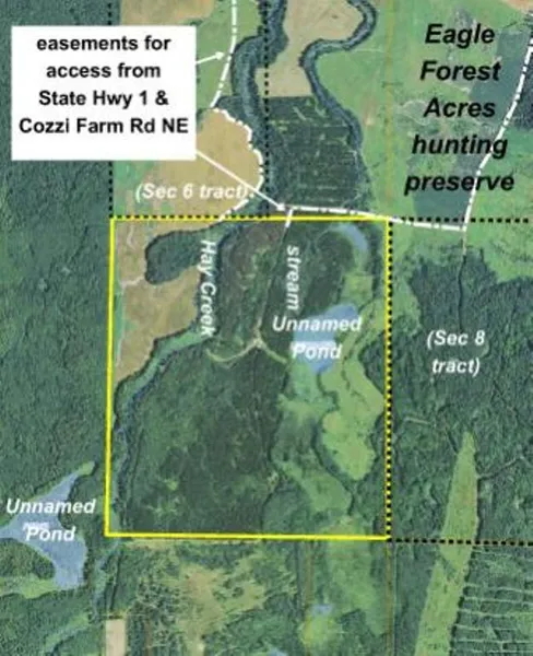 This 563+ acres on Hay Creek is near Red Lake in Minnesota's Beltrami County and is adjacent to Eagle Forest Acres hunting preserve. Combination of open field, heavily-wooded upland, wooded lowland, ponds connected by a stream, and preserved creek frontage. Trail system throughout. Can be combined with other available tracts for up to 2,700 acres of ownership. Easement off State Hwy 1 provides access. Red Lake is a prominent Walleye fishery, and the area has abundant wildlife, secluded wilderness, and boundless recreation. Nearby Bemidji, Blackduck, and Redby offer necessities and amenities.
