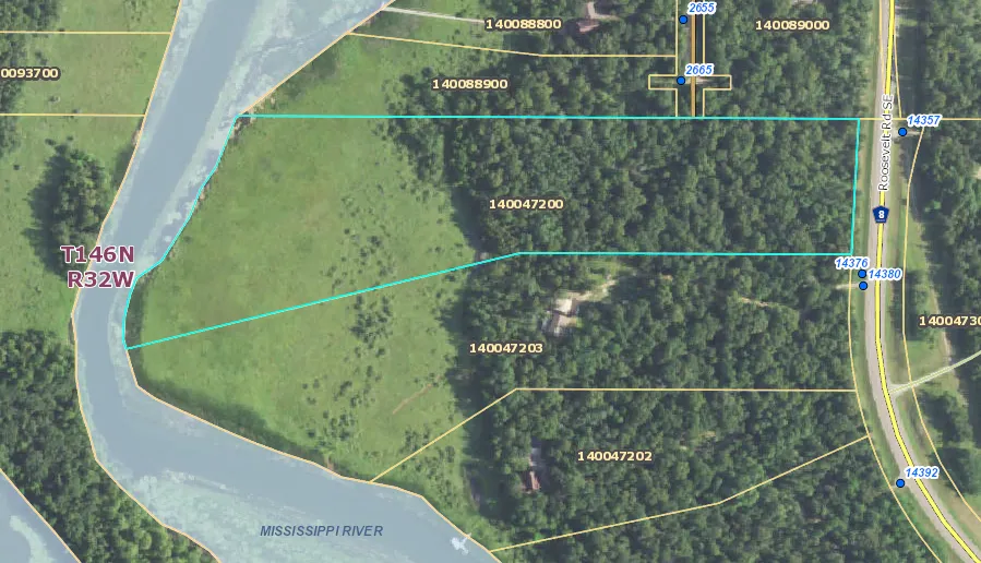 14.8 acre wooded lot with approx 620' Mississippi River frontage between Lake Andrusia & Wolf Lake. Excellent building sites. Boardwalk necessary to access river.