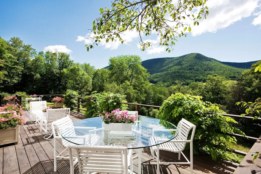 Must-see Contemporary with four bedrooms and five baths on 8.47 acres +/- and Big Mountain Views. Built-in 1973 with a total of 5,293 sq.ft, this home offers three floors of comfortable living space and plenty of room for holiday get-togethers. The home features a large living/dining great room (33 x 28) with vaulted ceiling, a wood-burning fireplace with built-in bookcases on either side, and access to the elevated sun deck. The kitchen with center island offers panels that open or close to the great room. Adjacent to the kitchen, enjoy the breakfast room's extraordinary views and the family room complete with a second wood-burning fireplace. A first-floor primary suite (28 x 20) features a gas fireplace and dressing room. Flooring throughout is a combination of hardwood, blue slate, and ceramic tile. Three additional guest suites, a two-car attached garage, wine cellar, greenhouse, and ample gardening space complete this unique home. The exterior is vertical wood siding with a handsome shake shingle roof. Come enjoy this property???s rural country setting, located on the corner of renowned Upper Hollow Rd and Red Tail Lane with stunning views across the Hollow to Netop Farm and beyond. You are certain to find this is a very charming and relaxed place to call home. We invite you to come take a look. All measurements are approximate.