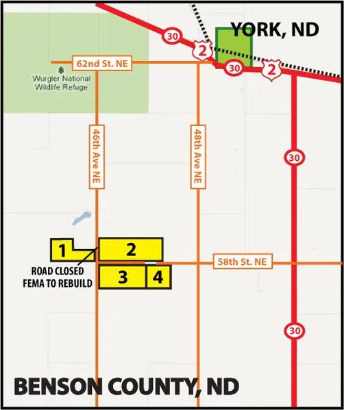 Driving Directions: From York, ND go on 62nd St. NE to 48th Ave NE and continue south 4 miles and go west mile on 58th St NE. This will bring you to the northeast corner of parcel 4. Take the field road west around back to 58th ST. NE to the intersections of 58th St. NE and 46th Ave NE. This will bring you to the corners of parcels 1,2, and 3.