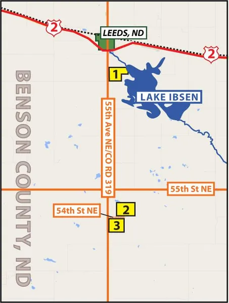 Driving Directions: From Leeds, ND at Highway 2 go south mile on Co Rd 319. This will bring you to the northwest corner of Parcel 1. Continue 5.5 miles south to 54th St NE. This will bring you to the northwest corner of Parcel 3. Go east on 54th St NE. This will bring you to the southwest corner of Parcel 2.