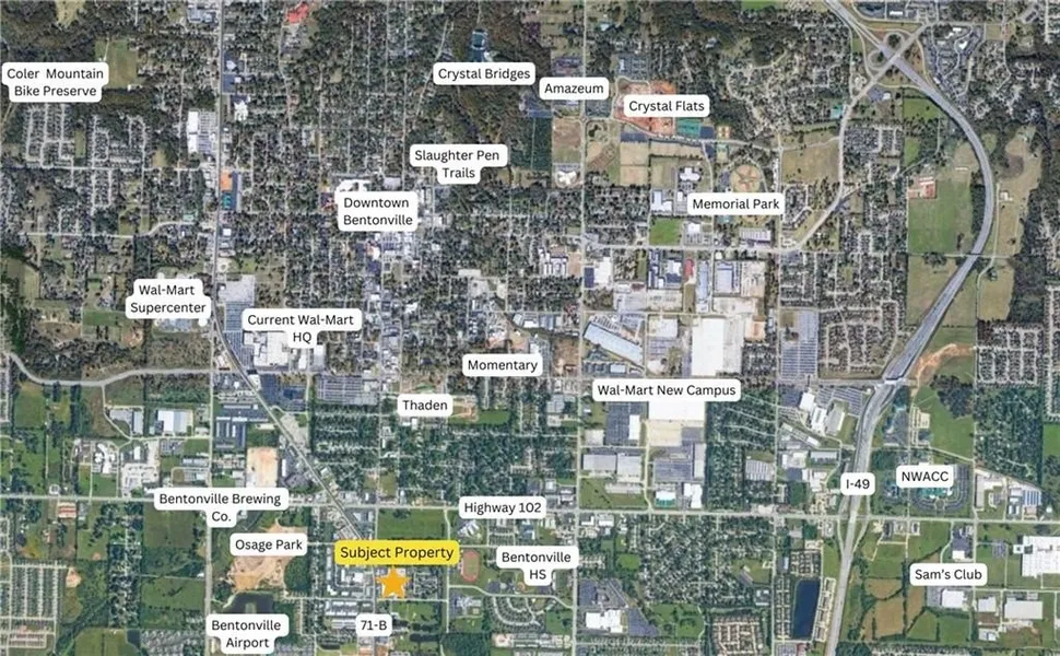 Premier commercial property in the heart of Bentonville, AR, ideally located on a hard, signaled corner w/ significant road frontage on both S Walton Blvd, 339 ft & SE 18th St, 581 ft. This property encompasses 2 buildings: 69,581sqft main building & 15,480sqft secondary structure, all situated on 7.36+/- acre lot w/ a large parking area. The building is fully leased, offering a steady income stream, & boasts a prime location w/ a high daily traffic count of 29,000, maximizing visibility. This property is strategically positioned near the Walmart Home Office, Bentonville Airport, Downtown Bentonville, & the planned 350-acre Walmart Home Office campus. Surrounded by a dynamic mix of dining, entertainment, & professional services, offering tenants & visitors easy access to all Bentonville has to offer. Investors seeking a top-tier property w/ immediate income potential, exceptional visibil...