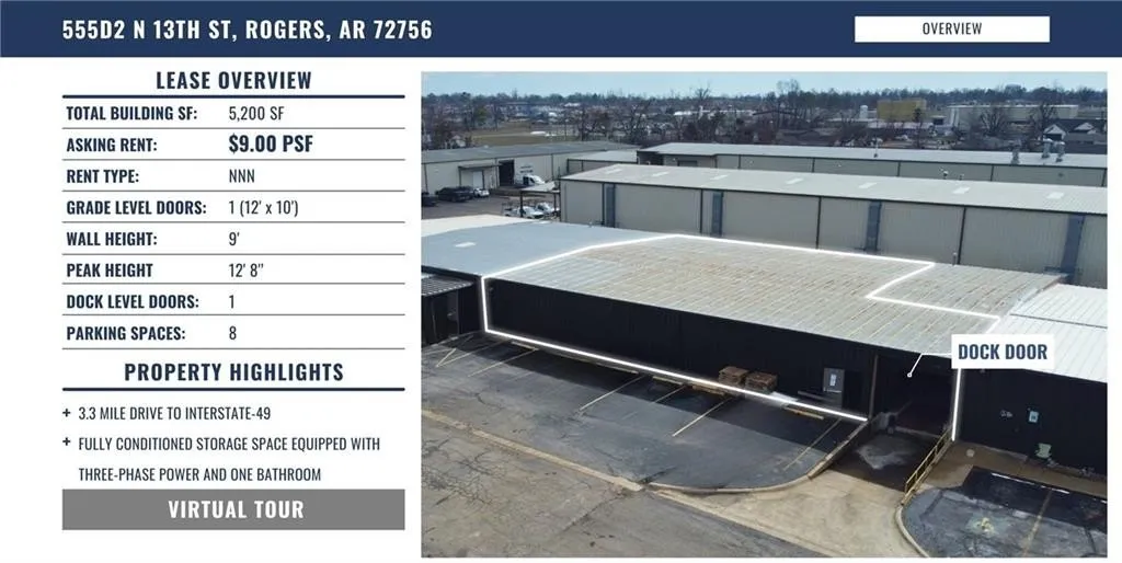 Fully conditioned storage space equipped with three-phase power and one bathroom.