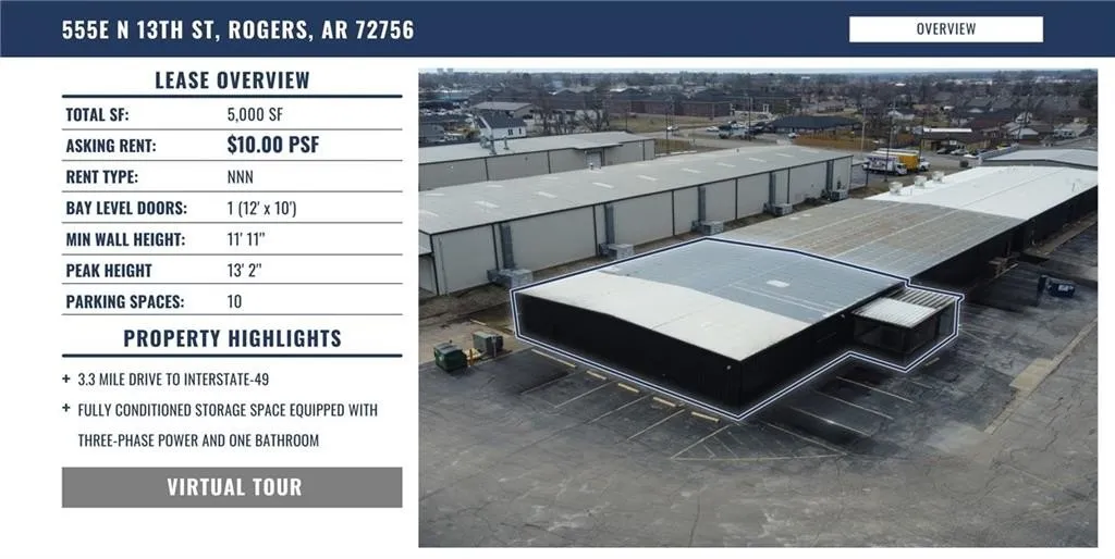 3.3 mile drive to i-49. Fully conditioned storage space with three-phase power and one bathroom.