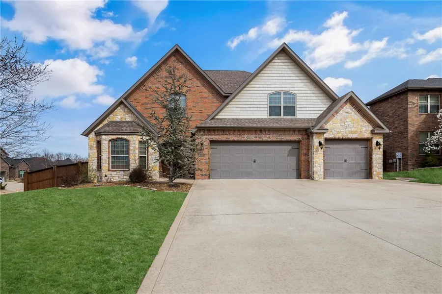 Great 4bdrm, 3 bath home in north Bentonville's highly sought-after neighborhood of Woods Creek. This home sits on half an acre on a double cul de sac street w/low traffic and is conveniently located to the community playground, pool and park. Huge windows across the back of the home showcase the open kitchen and living room featuring a large kitchen island complete w/ veggie sink, pot filler, corner fireplace & formal dining room. In addition, the main level is home to the master bdrm & bath, as well as, a second bdrm and full bath down. Upstairs you will find two additional bdrms w/ a jack-n-jill bath & an oversized bonus room w/ wet bar. Step out back & enjoy the oversized deck, professional landscaping that allows for privacy & a rock bench perfect for a firepit. Close to New Walmart Campus, ISD, I49, NWACC, Downtown BVille, Bike/walking trails. New roof in 2020.