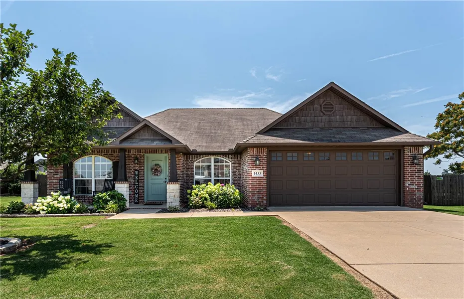 This charming one-level 3 bedroom, 2 bath home offers the perfect blend of style, location, and affordability. The main living space includes numerous built-ins, a vaulted ceiling, open floor plan, and a warm & inviting brick mantle with gas-log fireplace. The adjoining kitchen provides ample cabinet, pantry, and counter space along with an eat-in-kitchen area with views of the back deck and green space. The bedrooms provide lounge space for relaxation, with carpet, walk-in closets, high ceilings, and updates like accent walls and shiplap. The master bath offers a relaxing soak/Jacuzzi tub, walk in shower, extra closet space, and a unique transom window. The covered front porch, back deck, and sizable flat lot offer ample space to host gatherings. The location is unbeatable! Just minutes from everything in NWA, this gem is a steal at $325k.