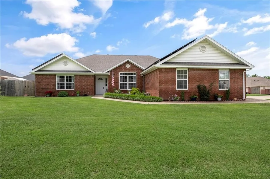 Meticulously maintained 3 bedroom 2 bath home with fully owned Solar Panels. Buyer will benefit with low cost utility bills. This full-brick home is situated on a corner lot with garage and driveway on the side. This home offers a spacious living area with vaulted ceilings, gas fireplace, eat-in kitchen & split floor plan. The large bedrooms allow plenty of space & storage for all the families needs. The primary bedroom offers an ensuite bathroom w/double vanity & walk-in closet. Fully fenced in backyard with a storage building & covered back patio for entertaining. Room for RV or boat with 27'x 40' gated and fenced designated parking area. Conveniently located close to schools, city park, and less than 10 miles to the new WMHQ, Downtown Rogers & Downtown Bentonville Square. Transferable home warranty included.