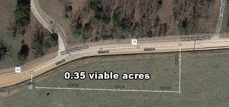 Total 0.49 acres, but actual viable land south of Hwy 33 is more like 0.35 acres (lot lines overlap road)