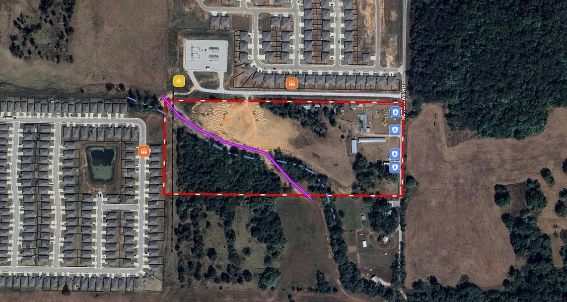 Significant site enhancements have already been made, with hundreds of loads of concrete and red dirt fill added to elevate the northern section of the property, providing a level building surface ready for your vision. A small wooded ridge in the southwest corner offers the perfect backdrop for larger, custom wooded lots, while a cleared area near the creek along the southern border presents a fantastic opportunity for a neighborhood playground or nature retreat.