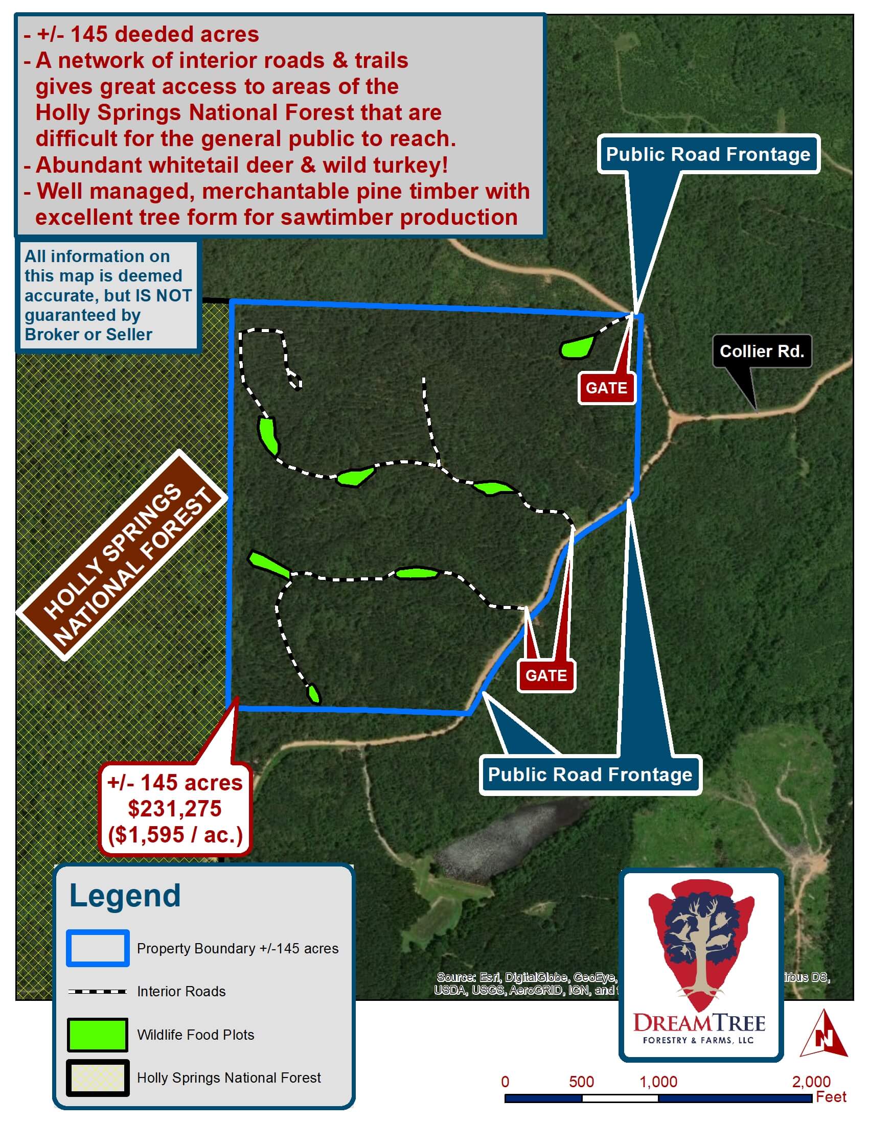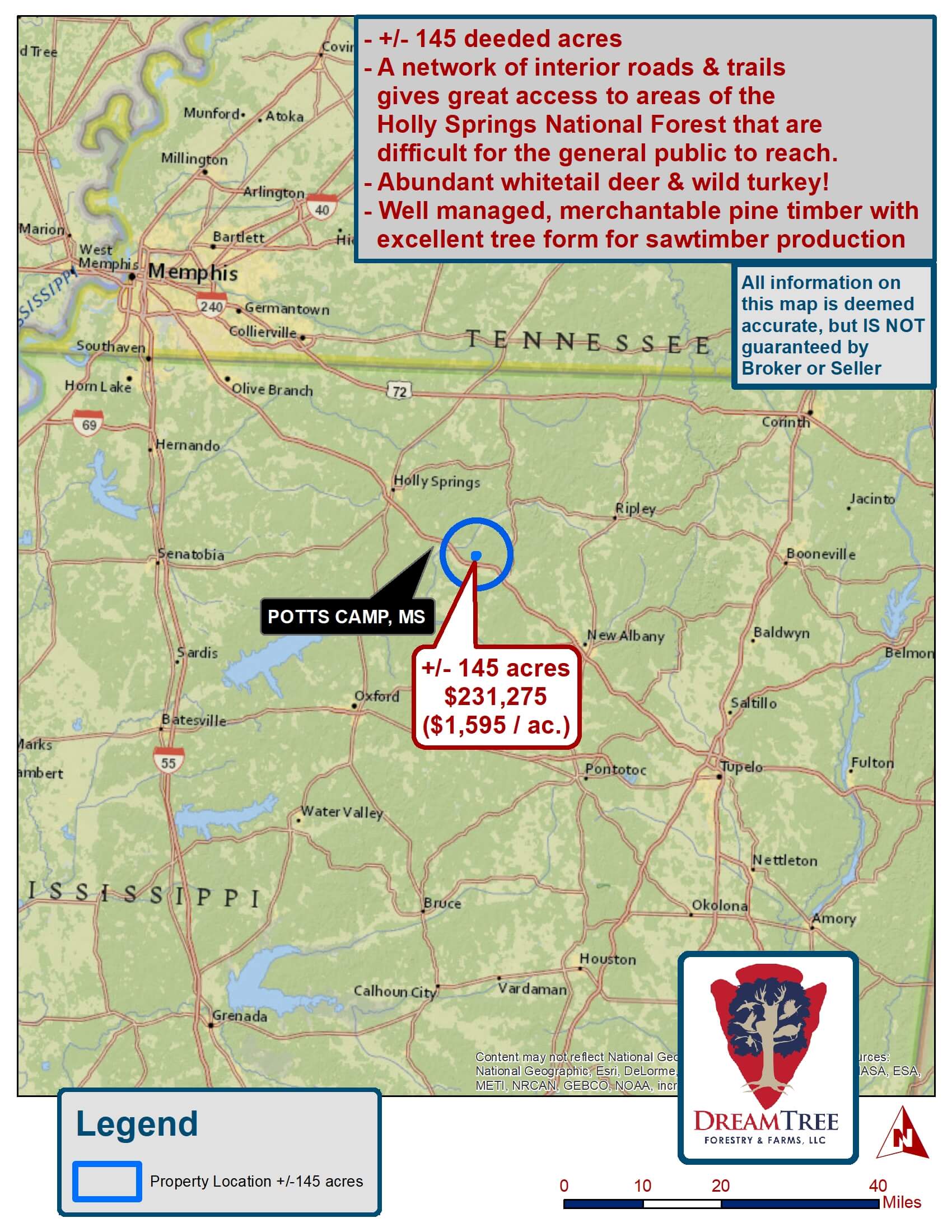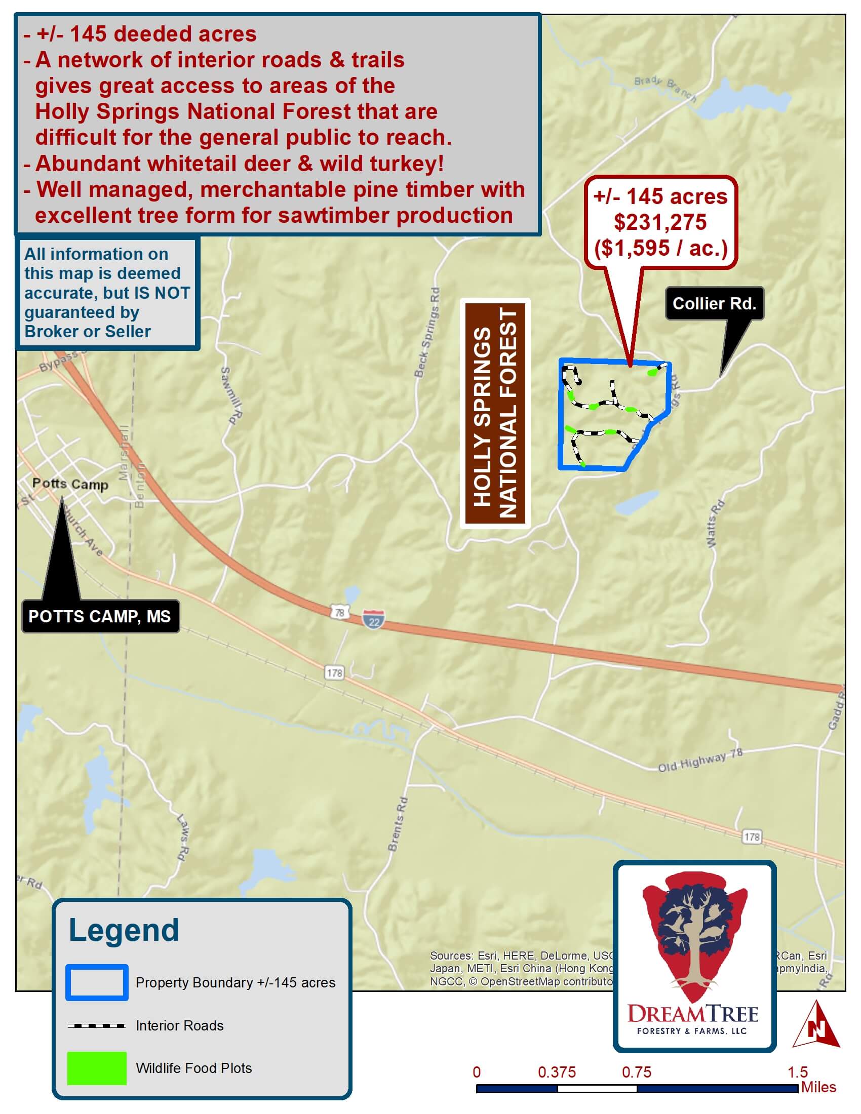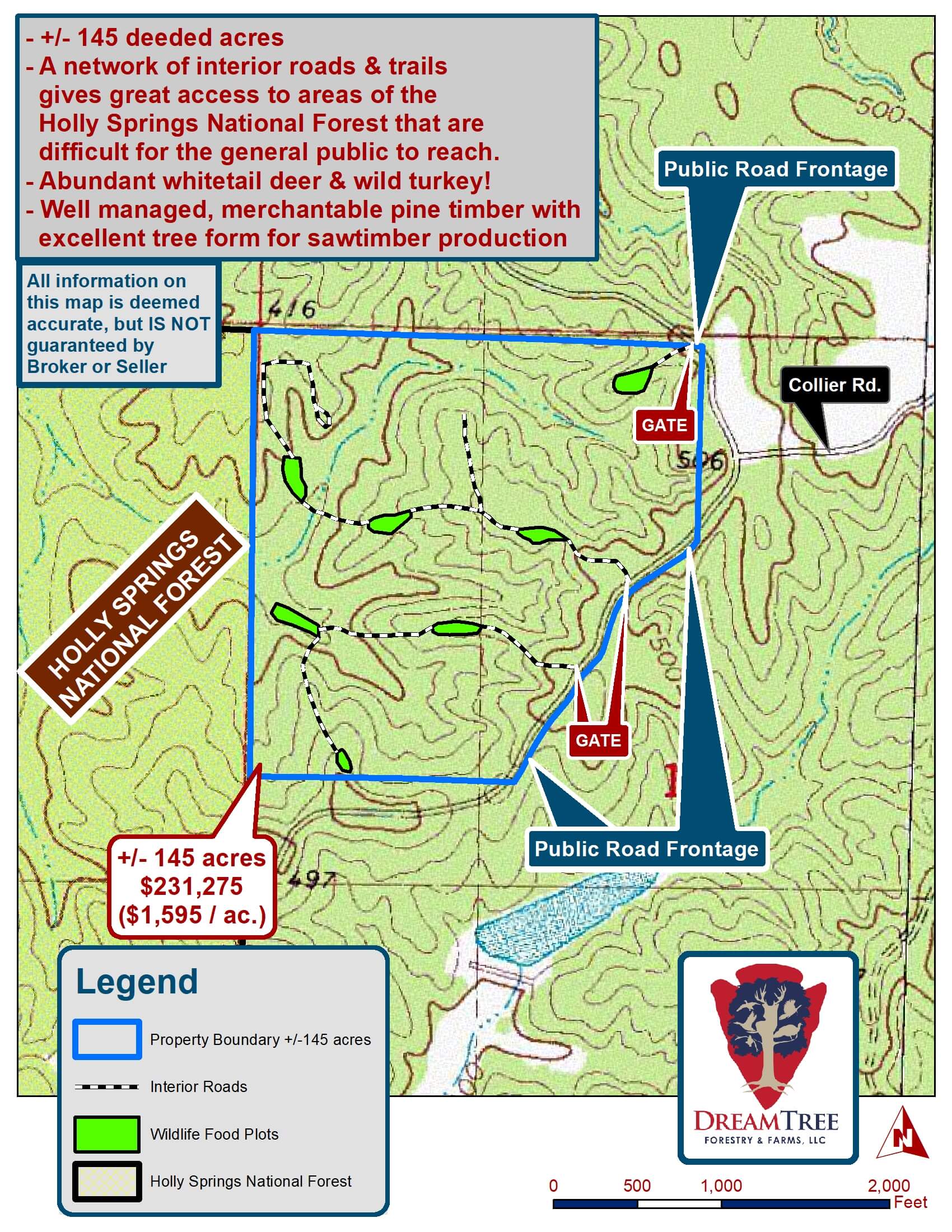 Merchantable timber, deer, turkey!! +/-145 acres of great timber land perfect for the outdoorsman or recreationalist that wants a good return on investment. 7 wildlife food plots are cleared and ready for your favorite forage. Deer, turkey, and other wildlife abound. The new owner will have easy access to portions of the Holly Springs National Forest that are difficult for the general public to reach. -3- gated entrances from the public road and an extensive, recently renovated interior road system provides great access for management and enjoyment! Don't miss this excellent opportunity!! Less than one hour from Memphis, Tupelo, & Oxford. Broker owned.