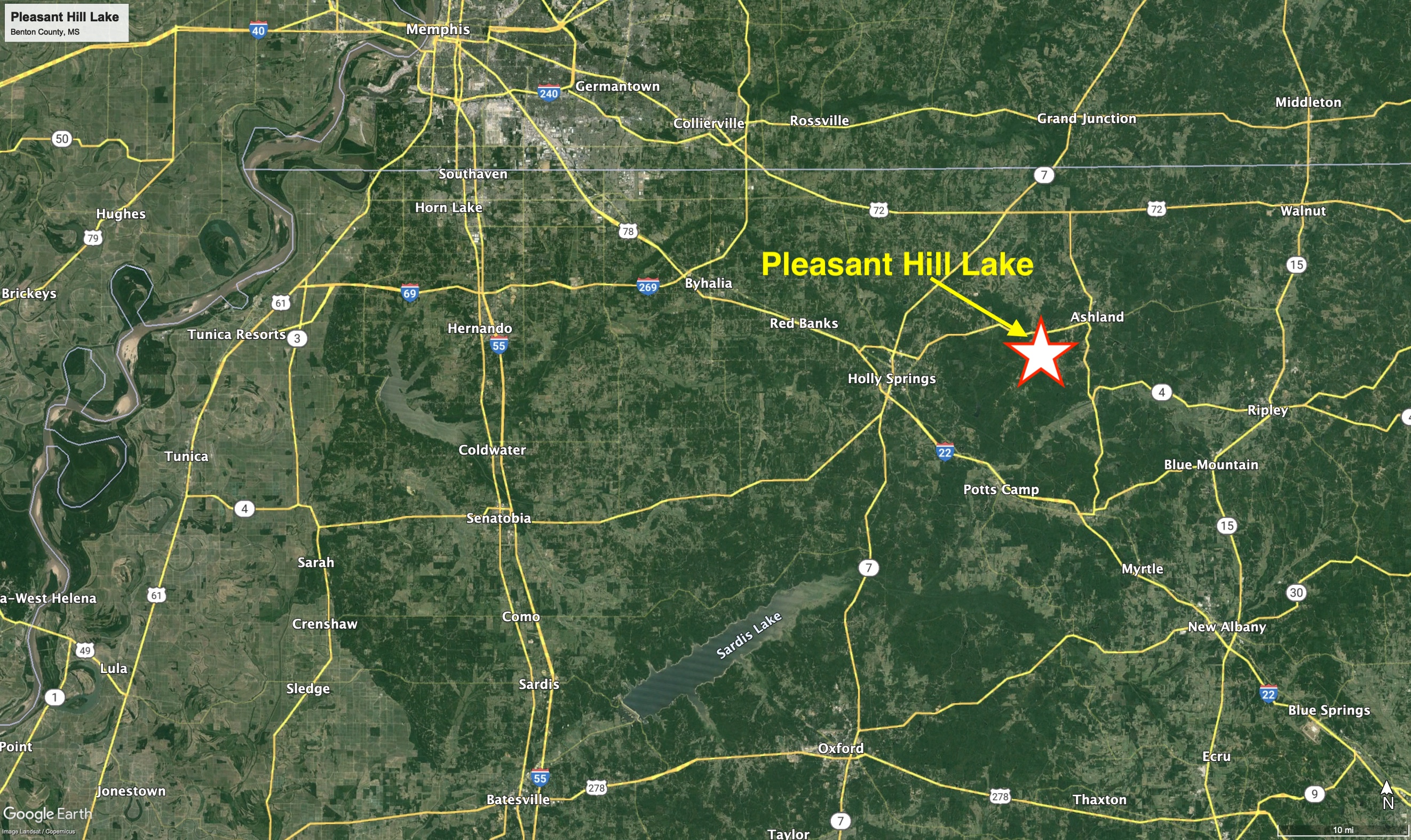 The fishing at Pleasant Hill is excellent with target species being: Largemouth & Spotted Bass, Bream, Crappie & Catfish. Pleasant Hill Lake is a rare opportunity to purchase an ownership interest in a huge North MS lake that is over 70 acres in size. The lake is spring-fed by multiple springs and has natural runoff from Big Snow Creek. These water sources help the lake maintain a stable water level year-round. The lake could be a fun retreat for multiple families to buy together and share in the great recreational opportunities the lake and land offer. There is a 3-acre lot overlooking the lake that will be conveyed with 100% ownership. This 3-acre lot lot has a well-appointed 2BR/1BA lake house with a commanding view down the middle of the lake. This lakehouse is perfect for weekend stays and has bunkbeds in one of the bedrooms to provide ample room for kids! Pleasant Hill Lake is truly a unique opportunity as lakes in this size range usually have many different landowners and complicated ownership. The main portion of the lake is shared with one other owner who also has a 50% ownership interest. Come see this beautiful property today and you may catch one of the local Bald Eagles soaring above the water looking for its next meal!