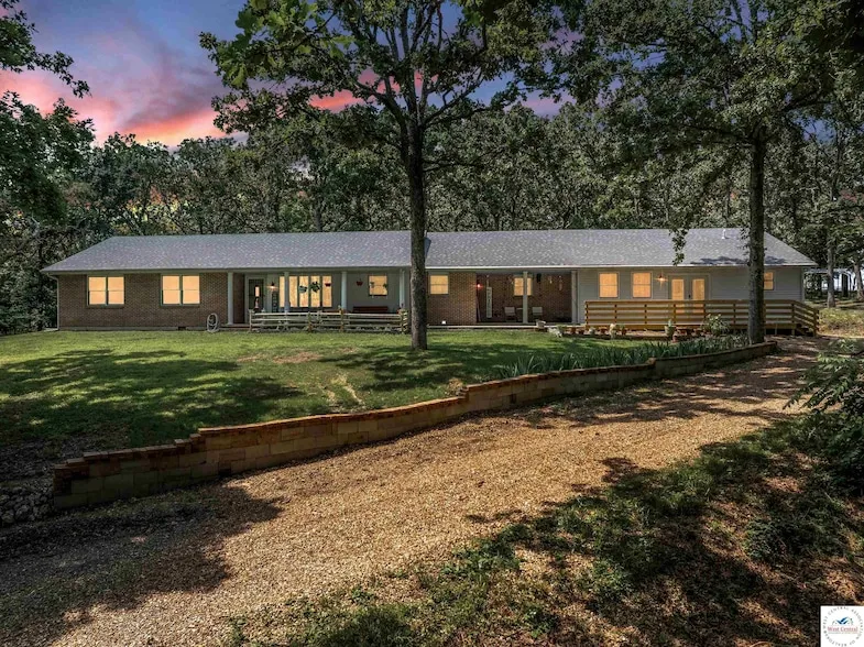 Nestled on a 22.99-acre lot with lush timber and wildlife, this ranch-style home offers privacy and convenience, minutes from downtown Warsaw, Lake of the Ozarks, and Truman Lake. It features dual living quarters on one floor, ideal for multi-generational living or guests. The original layout includes a cozy living room, 4 bedrooms, and 2.5 bathrooms. The large eat-in kitchen has ample cabinetry and a dining area with a bay window. A recent remodel added two bedrooms, a full bathroom, a family room, and a laundry room. The addition also includes a "Man Cave," walk-in pantry, and office/media room, with access to the crawl space, water heater, and water softener. Energy efficiency is highlighted with ground source heating and cooling in the original section and separate heating and AC in the remodeled attic. The home has a new roof and septic system for peace of mind. In total, the home o...