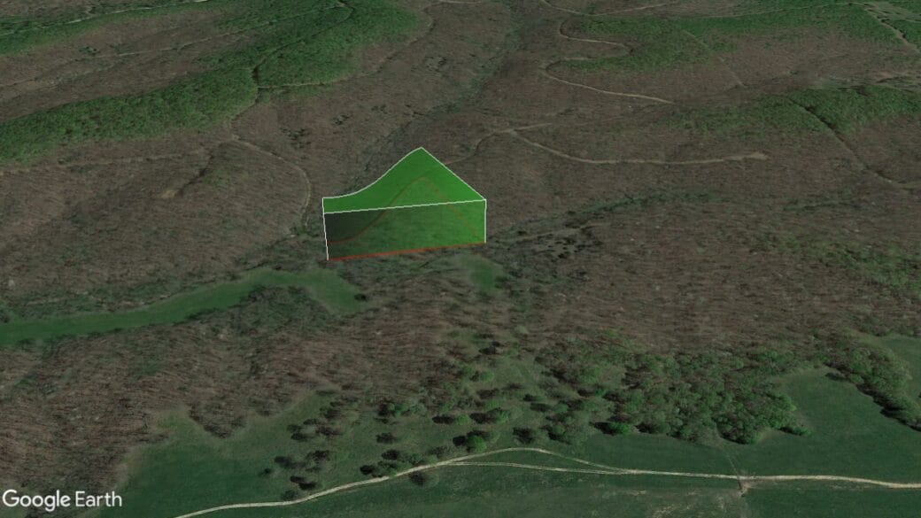 Coordinates: NW corner: 38.2089, -93.0895 (Road) NE corner: 38.2100, -93.0879 (Road) SW corner: 38.2085, -93.0895 SE corner: 38.2085, -93.0874