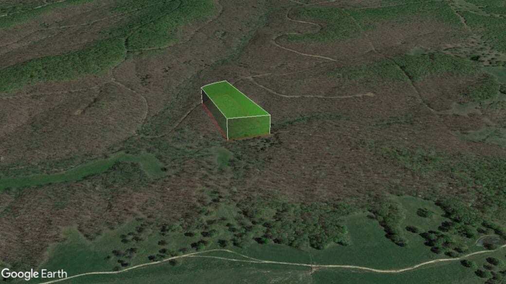 Coordinates: NW corner: 38.2100, -93.0879 (Road) NE corner: 38.2102, -93.0871 (Road) SW corner: 38.2085, -93.0873 SE corner: 38.2084, -93.0861