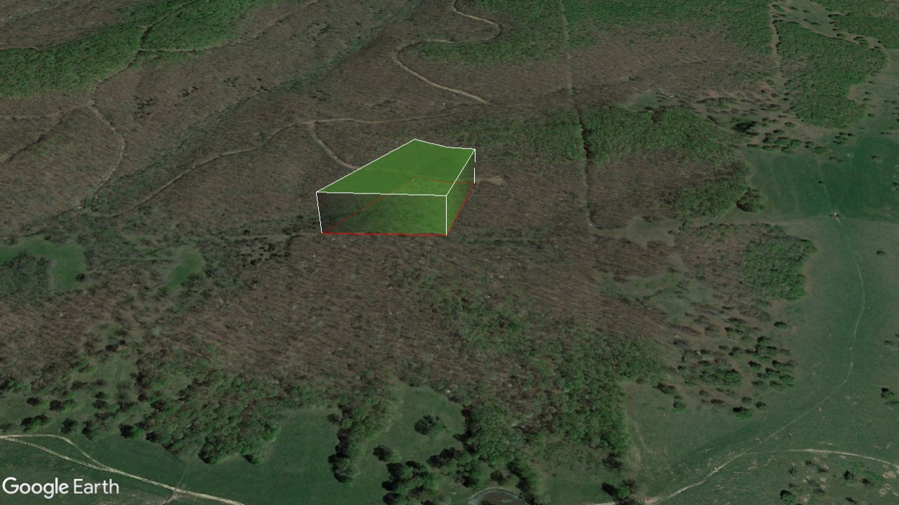 Coordinates: NW corner: 38.2096, -93.0840 (Road) NE corner: 38.2094, -93.0829 (Road) SW corner: 38.2084, -93.0855 SE corner: 38.2083, -93.0834