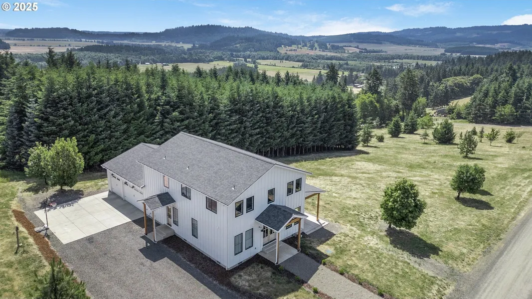 Phenomenal views in every direction! Experience the perfect blend of modern design and country tranquility in this custom-built farmhouse home, set on sprawling acreage with sweeping views of the rolling hills. This thoughtfully designed home features an open-concept layout with warm wood accents and a stunning kitchen equipped with quartz countertops, premium appliances, and custom knotty alder cabinetry. Expansive windows flood the living and dining areas with natural light, while the covered patio offers seamless indoor-outdoor living ideal for entertaining or relaxing in peaceful seclusion. Spacious main-level master suite, dedicated home office, and a large upstairs bonus/family room with more incredible views. The oversized three-car garage includes an EV charger for convenient electric vehicle charging, ample storage, and a generator power inlet for reliable backup power. A heat pump water heater provides energy-efficient hot water, and a detached shed with a roll-up door enhances the beautiful grounds, completing this rare opportunity to enjoy upscale rural living. One of the sellers is an Oregon licensed broker.