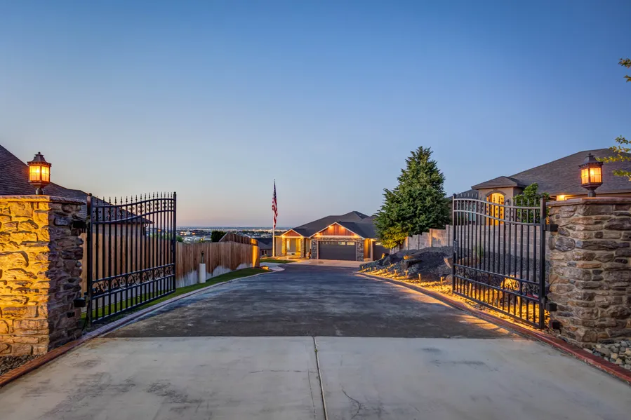 As you enter the private gated drive, you will be greeted with gorgeous views! This exceptional home is in an upscale Kennewick neighborhood and offers quality construction throughout the rambler w/basement floorplan, with 3876 sq ft of living space, open great room, boxed beamed ceiling detail, Adore lighting, gas fireplace with stone accents and built-in surround, beautiful wood flooring, plumbed for central vac, chef's kitchen with large island, granite counter-tops, stainless steel appliances, gas range w/hood and pot filler, apron sink, Insta hot water, tile backsplash, and an abundance of cabinetry. You will also find a laundry room w/shoe & coat storage, large family room w/movie projector, 5 spacious bedrooms and 4 full bathrooms, including an elegant master suite with coffered ceiling, access to the balcony, large walk-in closet, dual vanities, soaking tub and gorgeous tiled walk-in shower. This amazing home sits on .44 acre lot with immaculate landscaping, terraced yard with waterfall feature, firepit, outdoor seating w/built-in lighting, large patio area for entertaining, Trex deck w/fan & wrought iron railing perfect for taking in the sunset views, stamped concrete, fully gated private entry with remote opening for security and privacy, plumbed for future hot tub & pool on upper yard area that would fit a 18x36 pool, hot/cold water hook-ups, RV hook-ups, 4 car garage with storage cabinets, and an extended driveway that is 130 ft that creates privacy and a place for kids to ride bikes and offers extra parking. Ideally located in Sagecrest, near great schools, medical, movie theater, shopping, restaurants, easy highway access for the commuter, and so much more! This home comes complete with a comprehensive home inspection and a 1 year home warranty