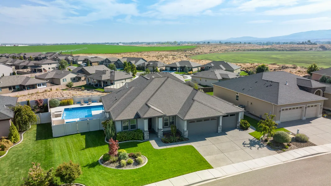 This beautiful custom home was built in 2015. During construction the owners were fortunate to be able to make several design changes that opened up the floor plan to accommodate both great room living and the luxury of formal dining. When deciding where to build they fell in love with the amenities that the Horn Rapids Golf Course community had to offer. When a lot came available on the prestigious Eagle Ridge Ct cul-de-sac, they seized the opportunity. Behind the lot is a slope and a protected natural area that gives an open big sky view with no one to block our sunsets and view. The perfect place to build the dream. As you approach and enter the home you are welcomed by so many stunning details, beginning with the 8' etched glass entry door. Notice the high coffered ceilings with tons of crown molding. Lots of millwork detail that makes the home feel timeless and sophisticated. A perfect entertaining house, with the large kitchen island to gather around and lots of room for playing games or watching your favorite show on TV. The home has 3 bedrooms AND a large den with beautiful glass French doors. There is a luxurious master suite that will make anyone want to relax and an additional guest suite with a private bathroom. Another favorite feature is the oversized three car garage. The extra space is a treat. The best part of this home is the amazing custom pool that beautifully wraps the backyard. With enough sun and shade to enjoy playing in the pool on a hot summer day, but also a relaxing on the covered patio. Pool is designed w/ large shallow end for the younger kids to play, while the older ones do cannonballs off the waterfall. You can sit on the cushioned pool steps and watch it all. A large garden area provides an abundance of fresh fruits and vegetables. Everything grows in this little corner. The blueberry and raspberry bushes, another favorite pastime for the kids. Watching the sunrise every morning with a cup of coffee on the outdoor patio is one of the favorite ways to start the day. Off in the distance you will be able to see Badger and even Jump Off Joe on a clear day. The home is also positioned that the east Sunsets are a beautiful way to end the day. Sometimes you can listen to the howl of a coyotes in the distance. The Horn Rapids community is a lovely place to live with maintained walking paths, tennis & pickle ball courts, golf course and restaurant right "on campus".