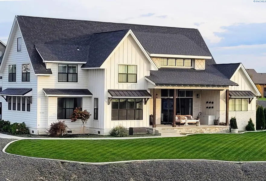 MLS# 282341 Elevate your living experience with this exquisite 2-story residence nestled in the beautiful Hidden Hills neighborhood of Kennewick. Spanning over 3,300 square feet, this 4 bedroom, 4 bathroom home combines elegant styling with a layout that prioritizes functional living. Built in 2019, this gem sits on a sprawling .81-acre lot on a cul-de-sac. Hardwood floors throughout the home provide for easy cleaning and minimization of allergens. The kitchen boasts an oversized 6-burner gas range and a well positioned quartz countertop for efficient meal preparation and entertaining. The main pantry features sliding barn doors on both sides, butcher block countertop and custom built-ins. A secondary pantry provides even more storage. The spacious living room with 14-foot ceilings and stone fireplace opens to both the front and back patios with large sliding glass doors that flood the room with natural light. The primary bedroom is conveniently located on the first floor and boasts vaulted ceilings, a luxurious en-suite bath and a spacious custom closet with shelving. The first floor also offers a separate full guest bathroom and an office with built-in cabinets and desk. The upper level reveals 3 large bedrooms with spacious closets, 2 elegant bathrooms, an open play area, a laundry chute and a bonus room, perfect for a gym or movie room. This home also includes a 3rd floor loft with installed shelving, which serves as a cozy reading nook or hideout. The fully fenced resort-like backyard beckons with a large covered patio, 8-person hot tub, pet-friendly turf, and a Snapsports sport court with basketball, volleyball, tennis, pickleball and street hockey capability. The attached 3-car garage offers one oversized RV bay and has been upgraded with plenty of shelving and wall mounts to make storage a breeze, and there are also outdoor RV hook-ups. The large front patio shelters an oversized swing and is a perfect gathering place for enjoying the stunning westward-facing views and breathtaking sunsets. The home also features a well-designed sprinkler layout and robotic lawn mowing system to make it easy to have the nicest lawn on the block.