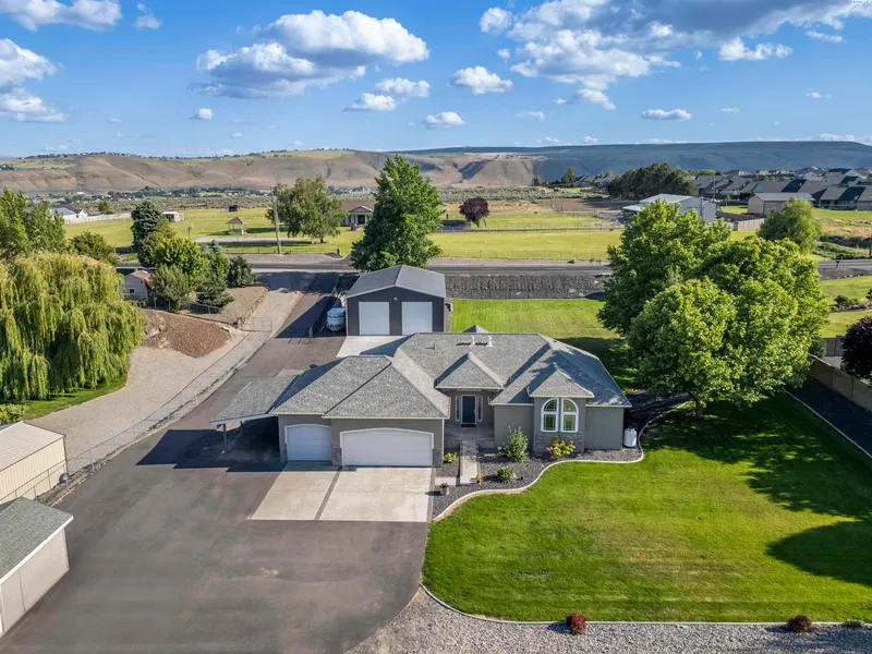 MLS# 284472 Nestled on over 1-acre of beautiful view property, you will discover this gorgeous home in Kennewick with a large shop! The home boasts 2907 sq ft of living space across a 1-level with daylight basement floor plan, offering 5 oversized bedrooms with large closets and 3 updated bathrooms to accommodate all your needs. Upon entering, you will be greeted by vaulted ceilings, beautiful hardwood flooring, and large windows that flood the living space with natural light while offering expansive territorial views. A custom stone fireplace graces the great room, offering the perfect space to gather with loved ones and entertain guests. The kitchen is the heart of the home, featuring a custom island, granite countertops, a full tiled backsplash, white cabinetry, all appliances, and adjacent to the kitchen is an inviting dining space to enjoy your meals. Whether dining inside or outside, the newly replaced deck features dual slider access, creating an ideal space for hosting summer BBQs and enjoying the panoramic views. The primary suite is a luxurious retreat, offering a coffered ceiling, deck access for enjoying morning coffee, a spacious closet, and a private bathroom with a dual sink vanity, soaking tub, and tiled shower. The laundry room is equipped with the washer & dryer included, a utility sink and additional storage cabinets for added convenience, and the HVAC system and water heater have been recently upgraded and replaced. The daylight basement adds more living space, including a family room with access to the covered patio and backyard and an adjacent office space. In addition to the extra deep attached 3-car garage, the property includes an impressive 40x60 insulated shop with 16’ walls, 2 12x14 roll-up doors, OSB on all walls, 125 amp service, and RV outlets, providing ample space for projects, vehicles, and toys. Attached to the home is a covered area for extra storage and there’s a detached garden shed for gardening tools & supplies. Located away from the main road, the property offers peace and privacy in a serene setting, with easy access to Kennewick and Richland amenities and a short drive to the freeway. Experience the best of both worlds in this exceptional property that seamlessly blends luxury and functionality.