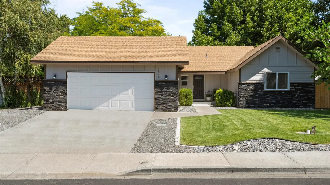 Welcome to this fully updated 1851 sq ft Rambler, thoughtfully updated with modern finishes and functional design. Enjoy spacious living in an open-concept layout, perfect for everyday living and entertaining. The heart of the home features a stunning kitchen with sleek concrete countertops, new white cabinetry offering abundant storage, a full-height tile backsplash, prep sink, and an oversized island with a stainless steel single bowl sink. The inviting living area includes a cozy wood-burning fireplace and a sliding glass door that opens up to the back patio... ideal for hosting family and friends. The spacious primary suite is a true retreat, complete with laminate flooring, walk-in closet, and a second sliding glass door leading to the patio. The stunning bath offers a tiled walk-in shower, dual vanity with quartz countertops, a linen shelf, and tile flooring. Two additional bedrooms and a well appointed guest bath with quartz countertop,shower/tub with tiled walls, and tile flooring. A convenient half bath is located off the kitchen. Additional highlights include new enclosed fencing with two side gates, new siding and masonry, new vinyl windows throughout, new interior & exterior paint, new flooring throughout, open back patio surrounded by mature trees providing ample shade, RV parking, insulated 2-car garage, and so many updates... this home is waiting for you!
