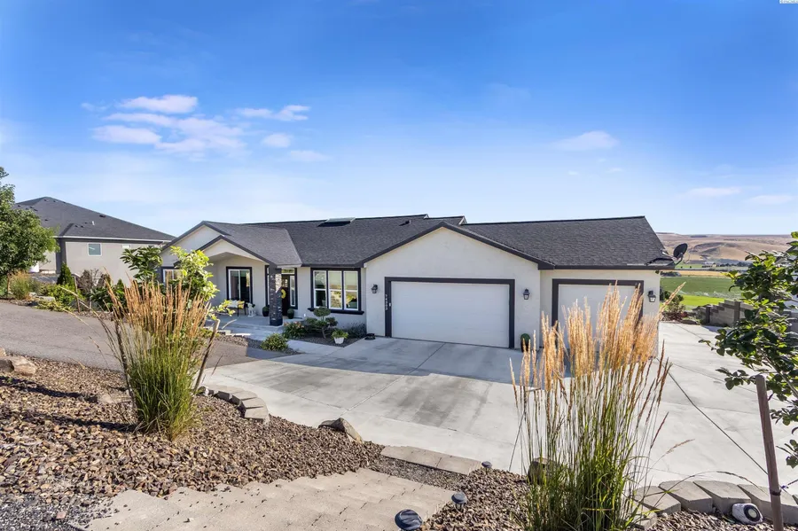 MLS# 285494 Welcome to this beautiful rambler with a daylight basement - perfectly positioned to capture unobstructed southern views of the Horse Heaven Hills. Built in 2017, this home offers endless possibilities for multi-generational living, guest accommodations or a separate apartment (would require a lower level door between levels). Step into a welcoming foyer with skylights for lots of natural light. Located just off the foyer is a den with French doors that provides a flexible space for a home office or library. Enjoy the easy care plank tile flooring throughout the main living areas (carpet in hallway, den & bedrooms). The great room features vaulted ceilings, a cozy gas fireplace and lots of large windows that frame the breathtaking views. The chef-inspired kitchen features leathered granite countertops, a farmhouse sink, full tile backsplash, stainless steel appliances, wine storage, pantry and a large breakfast bar island with storage and pendant lighting above. A sliding barn door leads to a convenient utility room with overhead cabinets, counter & sink. The primary suite also enjoys sweeping views and includes a spa-like bath with quartz countertops, dual sinks, freestanding tub, mud-set tile shower, private water closet and a large walk-in closet too! Two additional guest bedrooms on the main level share a .75 bathroom. The walk-out daylight basement has a family room, kitchenette, 14x11 bedroom with an 8x10 walk-in closet and a .75 bath - ideal for extended stays or separate living quarters. There's tons of storage throughout PLUS an insulated 13x7 exterior accessed storage room with concrete flooring and lighting. Updates include: 50 gallon hybrid water heater ('22), Crusader water softener system ('22), 130 MPH rated Owens Corning Durations shingles ('23) and a 4 ton American heat pump ('25). Easy exterior access makes enjoying the backyard seamless. And yes - the view from the lower level is just as awe-inspiring. Situated on a 1.04 acre lot, there's ample space to create your dream outdoor oasis - maybe a future in ground swimming pool? With easy freeway access and a short drive to the Queensgate shopping area (with the the new Costco, restaurants, theater and more - your dreams of country living with the convenience of city amenities are right here!