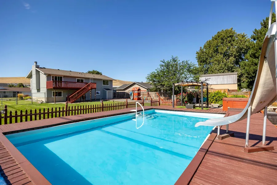 MLS# 286213 Welcome to this beautifully updated mid-entry home nestled in The Foothill neighborhood of Kennewick, situated on a spacious 1/3-acre corner lot complete with a refreshing pool! Offering 1,991 sq ft of comfortable living space, this home features 4 bedrooms and 3 bathrooms. Step inside to a bright and inviting interior, where durable hard surface flooring flows seamlessly through the main living areas. A cozy wood-burning fireplace provides warmth and ambiance on cool nights. The open living area flows effortlessly into the charming dining space, which offers a slider leading out to the deck—ideal for both indoor and outdoor dining and entertaining. The kitchen is equipped with rich wood cabinetry, stainless steel appliances, granite countertops, tile floors, and ample space for the chef, making meal preparation a joy. The primary bedroom includes double closest for all your personal belongings and a private bathroom for added convenience and privacy. The lower level offers a spacious family room, perfect for a movie theater setup, home gym, or additional living area to spread out. Step outside to your own private retreat: a large fenced yard featuring an inviting pool and expansive pool deck for summer fun, complemented by a relaxing hot tub for unwinding in the evenings. Enjoy the tranquil water feature pond designed for your Koi fish, gather around the firepit, and take in the beautiful landscaping. Kids will love the playground area, while the huge lawn, garden space, and gravel areas provide plenty of room for outdoor activities. An attached 2-car garage completes the package. This move-in-ready home offers the perfect blend of indoor comfort and outdoor enjoyment—your personal haven awaits! Contact your favorite realtor for a private showing before this one is gone!
