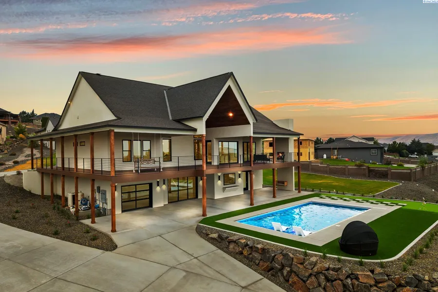 MLS# 287037 Proudly introducing the 47 North 2025 Luxury Showcase! Situated on a full 1-acre lot with panoramic views of Badger Canyon, this 4,770 sqft custom estate perfectly blends elegance, comfort, and functionality. Step inside and be welcomed by the soaring 22-foot ceilings in the great room, three cozy fireplaces, and a seamless open layout designed for both entertaining and everyday living. The chef’s kitchen is a masterpiece, featuring Taj Mahal quartzite countertops, custom cabinetry, and a premium LG Signature Kitchen Suite appliance package, while a full second kitchen downstairs offers convenience for gatherings or multi-generational living. This home includes 4 bedrooms, 5 bathrooms, an executive office, a theatre room, plus a home gym that opens to a single garage bay. To top it off, the home features a fully integrated surround sound system extending throughout the interior, RV garage, and outdoor patio. The exterior is equally impressive. Relax or entertain on the expansive wrap-around covered deck with stained tongue and groove ceilings, or enjoy your private backyard oasis featuring an 18x36 sport court pool, a putting green, and abundant space to entertain. Car enthusiasts will love the oversized 4-car RV bay garage with custom checkered epoxy flooring, designed to fit RVs, boats, or other toys—with ample additional parking and a private driveway. Plus, there’s plenty of space to build your dream shop. This one-of-a-kind property offers the perfect balance of luxury and lifestyle—truly a home where every detail has been thoughtfully crafted.
