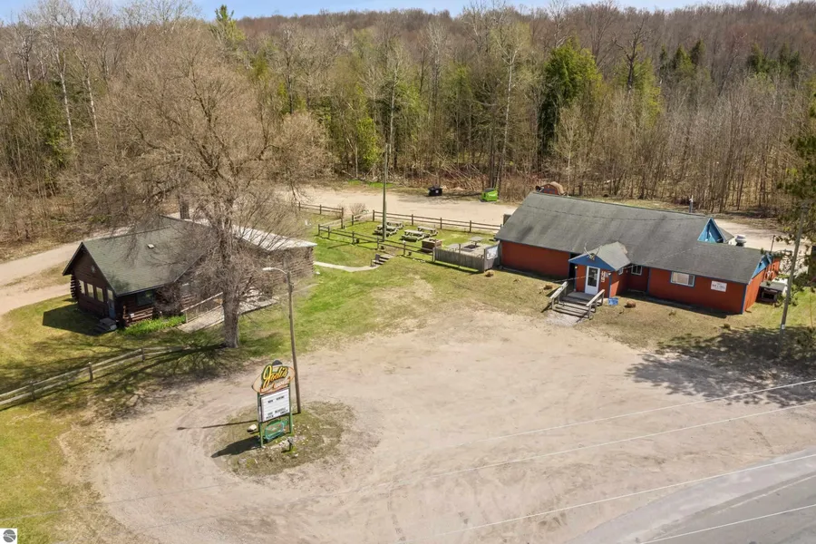 Work and live on the same site. This bar/restaurant has been owned by the same person for 20 years. Has been a bar/restaurant in this location for 50 years. Not only is it turn key ready to go but, also features a 2 bed 1 bath log home on this almost 3 acre corner lot of one of the busiest intersections in Benzie County. New equipment since 2022 for the bar is, natural gas furnace, water cooled ice machine, stainless steel deli table, new compressor and evap in a freshly insulated walk-in cooler. Updated plumbing and electric service, new char broiler, new gas deep fryer, new bar stools and toilets, new drain field for the septic, 3 freezers in the storage barn, new central air unit. All new flooring in 2022 as well. this business also includes a liquor license, Sunday alcohol sales, carryout permit, patio permit, and a dance license. 6 taps and beer coolers, capacity is 75 inside and 75 on the outside patio. The 2 bed/1 bath log cabin features a new septic and drain field, upgraded electric and plumbing. Walls were re-chinked in 2021. Natural gas, freshly painted interior, attached 1 car garage, large storage area that could be easily turned into more housing and plumbed for an extra bathroom. Short term rentals are allowed. Don't miss this opportunity to own an established business in a location close to everything that Benzie County has to offer.